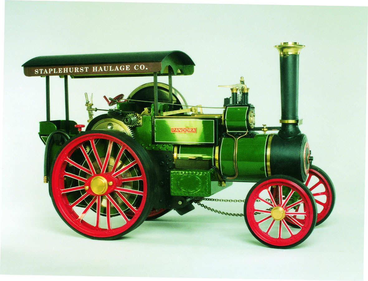 The Road Locomotive was very much a development of the Agricultural Engine with certain modifications to make it more suited to its purposeof heavy road haulage. Rubber tyres were almost universally adopted to reduce damage to the road surface. This had the added advantage of affording the driver a much quieter, smoother and less fatiguing ride. In addition the Road Engines were expected to work longer distances between refuelling and so had a belly tank for extra water and an extended bunker for added coal capacity. The driver was offered some protection from the elements with a canopy while an attempt was made to prevent horses being frightened by the fitting of a disc flywheel and motion covers. This is the type of engine that would be used to haul the largest loads of the day, many too large to be taken by rail. This is the most appropriate engine to use with the ride on Low Loader.